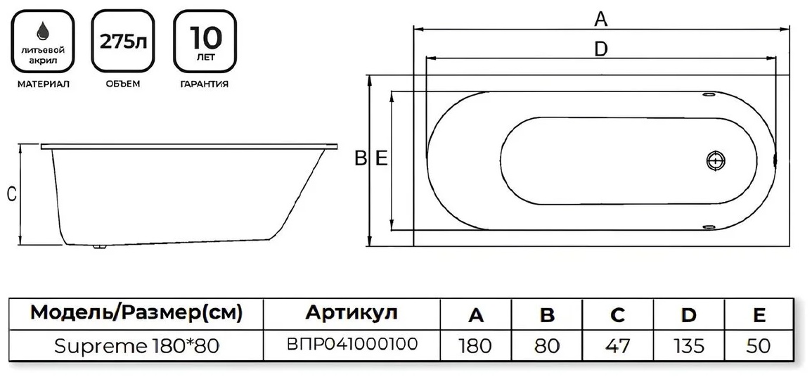 • APPOLO Ванна акриловая SUPREME 180*80