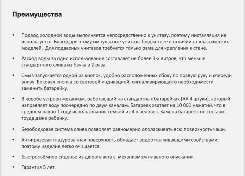 ПЕРЕД ЗАКАЗОМ импульсного унитаза убедитесь что давление воды в трубе от 2 до 5 атмосфер, в противном случае система работать не будет. Импульсный механизм слива; Расход воды: 4 л. Унитаз подвесной с установочной рамой и с сиденьем в комплекте; Цвет: белый глянцевый; Жесткое быстросьемное сиденье из дюропласта; Металлические крепления; Антигрязевая глазурованная поверхность; Тонкая крышка; Грязеотталкивающее покрытие. Импульсные унитазы - это идеальный вариант для экономии площади в санузле. Для импульсного унитаза не требуется бачек или инсталляция. Подключение только к холодной воде. Импульсный слив обеспечивается трехступенчатым режимом, на первом этапе которого создается водяной поток «торнадо», омывающий всю чашу унитаза, затем направленная струя выталкивает содержимое в канализацию и в заключении чаша наполняется водой для обеспечения водяного затвора. Для монтажа системы необходимо чтобы давление в стояке составляло от 1,2 до 5 атмосфер, в противном случае система перестает работать.